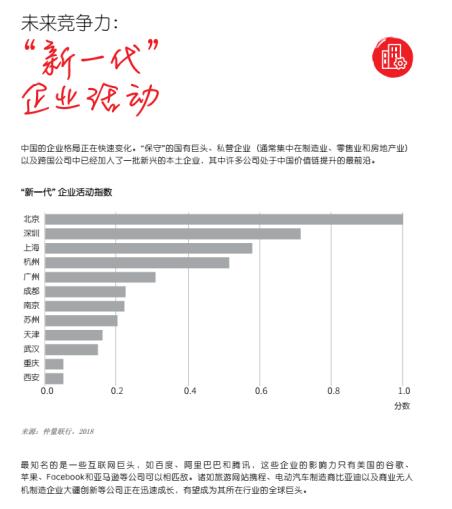 报告显示,北京和上海在“传统”和“未来竞争力”指标上都占据主导地位,凭借其庞大的规模及高度集中的财富,这两座城市在众多排名中都占据榜首。值得一提的是,北京在教育、创新和“新一代”企业方面的表现均让其他城市望尘莫及,尤其是“新一代”企业活动指数远超其他11个城市。